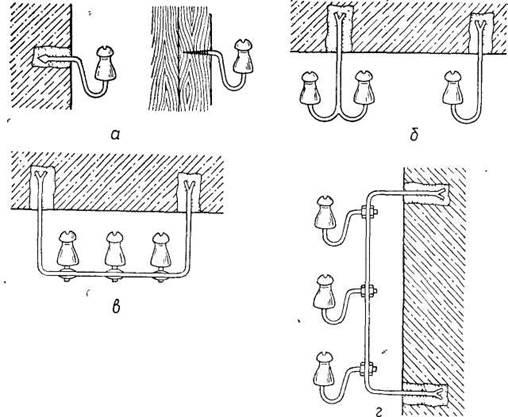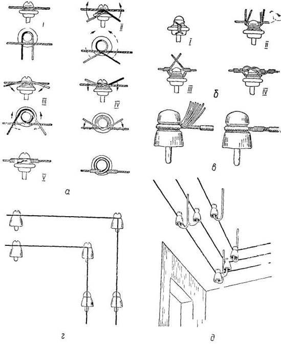 Монтаж проводів починають з розкладання заготовленої проводки вздовж траси з таким розрахунком, щоб відгалуження до світильників, вимикачів і штепсельних розеток розмістилися на ізоляторах. Далі накидають проводи на ізолятори, закріплюють на початку ділянки проводки і, натягнувши вручну або поліспастом, кріплять їх до головок і шийок ізоляторів оцинкованим дротом 0,8—І мм, попередньо намотавши на проводи 2—3 шари ізоляційної стрічки для запобігання пошкодженню його ізоляції (прорізанню) в'язальним дротом. На прямих ділянках проводки проводи кріплять на шийках або головках ізоляторів,
