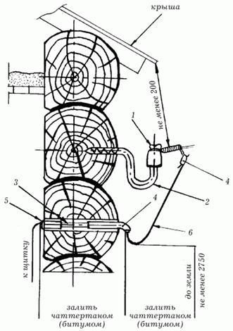 Введення дротів ВЛ в дерев'яну будівлю: 1 – ізолятор; 2 – крюк; 3 – трубка ізоляційна напівтверда; 4 – воронка фарфорова; 5 – втулка фарфорова; 6 – дріт.