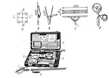а — шаблон; б — розмічальна жердина; в — дерев'яний циркуль, г — розмічальна рама з жердиною: д — висок із шнуром; є — набір розмічальних інструментів: 1 — телескопічна лінійка; 2 — кутомір; 3 — рулетка; 4 — розмічальний трафарет