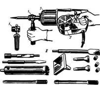 Застосовують також ручний електроперфоратор ударно-обертальної дії ИЭ-4713.Вибірку борозен у гіпсолітових перегородках і цегельних стінах для прокладки проводів при схованій електропроводці виконують механізмом МВБ-2МУ, що дозволяють заготовляти борозни шириною 8 мм і глибиною 20 мм. Приводом у механізмі служить електросвердлувальна машина ИЭ-1022А, від якої обертовий рух передається на фрезу через спеціальний понижувальний редуктор, а робітником інструментом - дискова фреза 3 з 24 зубами, оснащеними твердосплавними пластинками (сплав ВКВ) Механізм має закритий робочий кожух 4 з пилозбірником 5, дві робочі ручки 1 і ролики 2 для зручності переміщення по робочій поверхні Вибірку борозен в оштукатурених поверхнях, гіпсолітових і цегельних стінах виконують насадками-борозноделами, що випускаються до свердлильної машини ИЭ1032), за допомогою яких заготовляють борозни тих же розмірів.