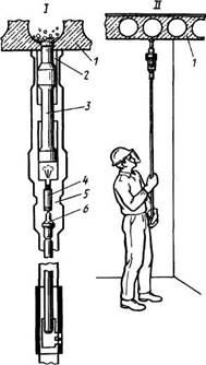 Отвори в багатопустотних залізобетонних панелях перекриттів при електромонтажних роботах виконують піротехнічним ударним стовпчиком КК-6В1. Стовпчик дозволяє протягом 1 год. пробивати 35-40 отворів 0 20-40 мм у панелях з бетону марки 200, 300 товщиною до 50 мм і комплектується запасними деталями й обладнаннями. У стовбурі 2 стовпчика (І) розміщений пробійник 3. У патронник стовбура встановлюють патрон 4. Стовбур з'єднується на різьбленні або іншим способом з корпусом 5, у якім змонтований ударно-спусковеий механізм. Під впливом пружини ударник 6 наколює капсуль патрона, відбувається вибух, і пробійник спрямовується вперед, пробиваючи отвір у багатопустотній плиті.