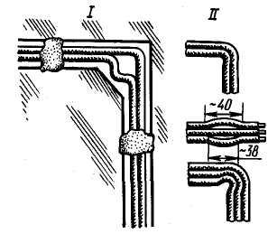 При виконанні поворотів дротів розрізають підставу між ними на відстані 38 мм і відводять одну жилу всередину кута (/) або згинають (//). Дріт в місцях повороту закріплюють «проморожуванням» алебастровим розчином або іншим способом