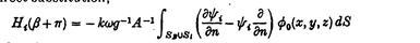 З цього випливає, що всі результати, які зв’язують властивості вимушеного руху твердого тіла в даному способі (Ньюман 1976), або ряд незалежно коливающихся твердих тіл (Срокоз 1979), відповідають задачі дифракційного розсіювання області набігаючої хвилі таким тілом або тілами, мають аналогію в поверхневих розподілах тиску. Відповідність буде, якщо тверді тіла прийняті як тонкі горизонтальні пластини, які роблять одиничні вертикальні коливання у вільній поверхні. Хоча вимагається, щоб к дорівнювало нулю в (А11) у цьому випадку, це не торкається результатів, які отримані за допомогою теореми Гріна. Відповідність завершується відзначенням, що вертикальна захоплююча сила на Sі, тільки iwpk-1qdi, тобто пропорційна об’єму потоку через Sі.