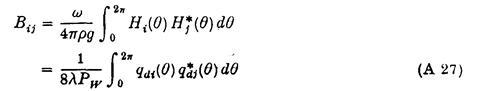 Тепер, в рівнянні додатка (А 27) показано, що елементи B пов’язані з елементами вектора qd таким чином, щоб необхідно було тільки визначити, вимушений об’єм потоку через кожну Sj завдяки дифрагованому потенціалу хвилі як в (А 17), для одержання елементів матриці демпфування B та результуючого Wmаx з (2.21). Тепер дифрагований потенціал виникає через присутність будь-якої встановленої твердої структури та не залежить від розподілів тиску. Таким чином, фd , а отже qdi може бути визначене використовуючи існуючі дифракційні програми, звичайні в корабельній гідродинамічній теорії.