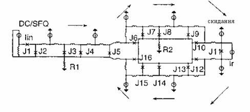 падає нижче певного значення. Скидання схеми супроводжується генерацією імпульсу SFQ через J2, не поширюються праворуч. JTL складається з трьох надпровідних петель у тому числі переходів J3-J5 й індуктивності L2-L4. Оскільки значення Ic і L і для кожного надпровідника контур менший, ніж в Ф0