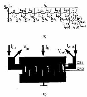Всі описані вище схеми елементів, що складалися з великих схем RSFQ або AD перетворювачів, за винятком осцилятора кільця і дільників напруги, які були реалізовані для дослідження операцій з частотами схеми SFQ. Ці самі схеми, не можуть бути поставлені на застосування. Колекторна схема складається з п'яти рамп краю переходів з накопичуючою горизонтальною площиною і спирається на операції SFQ. Зміна інтерфейсу переходів та верхнього шару грунту площини (HUG структури) застосовані в процесі виготовлення. На рис.23 показана схема дизайну колекторного ланцюга. SFQ імпульс струму Ip
