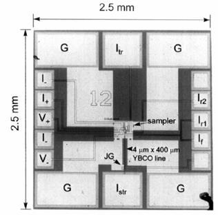 Рис.24 показує зразок чіпа для вимірювання високих частот роздільною здатністю. Чіп є відносно невеликим (2,5 мм квадратних), так що високошвидкісних ліній струму на підтримку STO (який має величезний діелектричної проникності) не вистачає. Сигнал струму заміряти цей зразок генерується сигнал входу по струму на Істр на чіпі Джозефсона сигналу генератора (СГ) і поширюється на зразок через 4 - му масштабі, 400 - м в довжину лінії без YBCO підходящу опору.