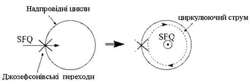 Магнітний потік квантів в надпровідних пристроях замкнутого циклу з мінімальним SFQ. На рис.1 показана найпростіша петля для замикання SFQ, для надпровідників, включаючи джозефсонівські. Як для магнітного потоку надпровідного переходу свинцю заборонено ефект Джозефсона Мейснера перехід грає роль "воріт" для виходу з петлі. Коли Джозефсонівських контактів вимикачів на напругу, магнітний потік іде