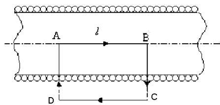 а) знайдемо циркуляцію вектора В вздовж замкнутого контуру ABCD (рис.1). У нашому випадку витки в соленоїді щільно прилягають один до одного. Соленоїд має довжину, значно більшу за діаметр.