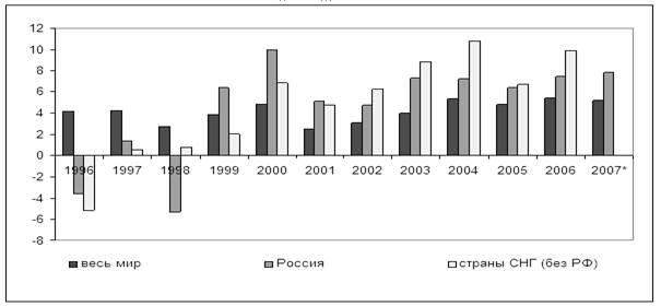 Рисунок 3. Темпы прироста мирового ВВП, ВВП России и стран СНГ без России, 1996–2007 гг. (в % к предыдущему году)