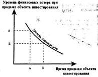 Следует отметить, что показатели ликвидности инвестиций по времени и уровню финансовых потерь находятся между собой в обратной связи (рисунок 2). Экономическое содержание этой связи заключается в том, что если инвестор соглашается на больший уровень финансовых потерь при реализации объекта инвестиций, он быстрее сможет его реализовать и наоборот. Наличие такой связи позволяет инвестору не только оценивать уровень ликвидности объектов инвестиций, но и управлять процессом их трансформации в денежные средства, варьируя показатель уровня финансовых потерь.