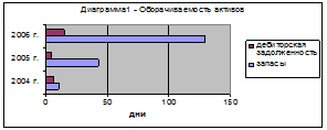Аналогичную тенденцию имеет и показатель длительности оборота денежных средств. Анализ, приведенный выше показывает, что у организации преобладает дебиторская задолженность над кредиторской. Это неплохая тенденция, однако чрезмерное превышение дебиторской задолженности с уменьшением денежных средств на конец периода, что и произошло в 2006 г. может негативно сказаться на платежеспособности организации, так как происходит изъятие средств из оборота, деньги не участвуют в ПФЦ и не могут приносить дополнительный доход.