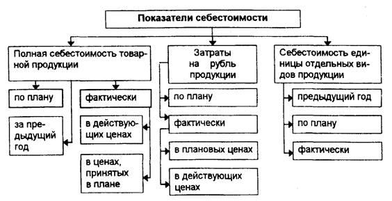 В хозяйственной практике предприятия планируют и учитывают следующие основные показатели себестоимости: полную себестоимость товарной продукции; затраты на рубль товарной продукции; себестоимость единицы изделий. Полная система показателей себестоимости показана на рис.1.