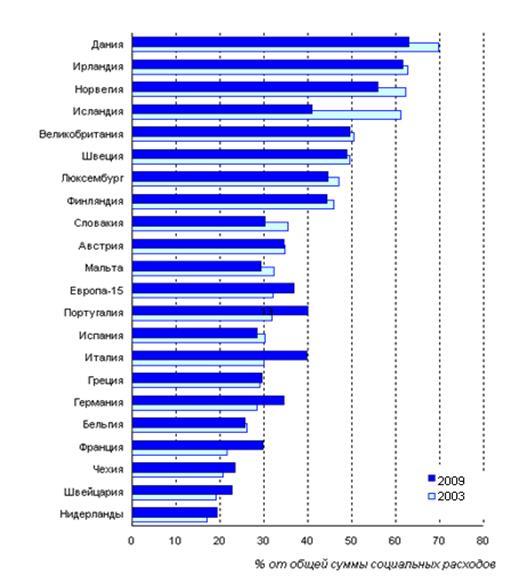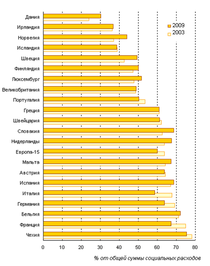 Доля расходов на социальную защиту от величины ВВП стран Европы-25 в 2000-2009 годы были примерно на 0,3 процентного пункта ниже, чем в Европе-15, но тенденция изменения их доли в ВВП была сходной. В странах, отличавшихся высоким приростом ВВП, снижение социальных расходов как доли от него было более значительным. Так, в Чехии она снизилась с 20,2% в 2008 году до 19,6% в 2009 году, на Кипре - с 18,5% до 17,8%, в Латвии - с 13,4% до 12,6%, Венгрии - с 21,1% до 20,7%, Польше - с 20,9% до 20,0%, Словакии - с 18,2% до 17,2%.