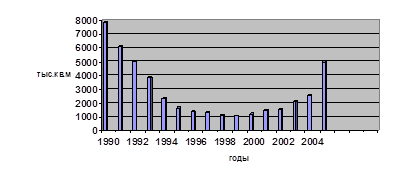Проведенный в то время анализ динамики строительства жилья, как наиболее представительный индикатор состояния рыночной экономики, отражающий темпы развития сопряженных отраслей и экономики страны в целом, открывал вполне реальные и заманчивые перспективы развития. За годы независимости строительный комплекс республики претерпел значительные изменения. Вследствие нарушения хозяйственных связей, прогрессирующей инфляции, сокращения инвестиций, объем ввода объем ввода жилых домов в 1991-1999 гг. сократился в 7,1 раза (рис.1).