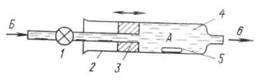 Рис. 1.10. Схема размывания пробы при заполнении петли: 1 — игла микрошприца; 2—уплотнение иглы; 3 — канал с пробой, не попадающей в колонку; 4 — петля; 5 — «язык» фронта пробы