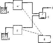 Рис. 1.6. Схема устройства для создания градиента высокого давления: 1 — к инжектору; 2 — смеситель; 3 — магнитная мешалка; 4 — насос для подачи растворителя А; 5 — насос для подачи растворителя Б; 6 — программатор; А и Б — слабый и сильный растворители