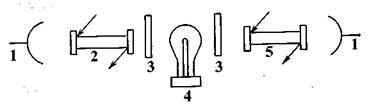 Рис. 1.11. Принципиальная схема УФ-фотометра с фильтрами: 1 — фотоприемник; 2 — рабочая микрокювета; 3 — фильтр; 4 — ртутная лампа; 5 — микрокювета сравнения