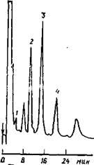 Рис. 1.15. Хроматограмма 5-гидроксииндолов из солянокислого экстракта 0,5 мл плазмы крови, полученная на колонке размером 200х3,2 мм с нуклеосилом С18 (5 мкм), подвижная фаза — 0,1 М нитратно-фосфатный буферный раствор с 12% метанола и 0,5 мМ октилсульфата, рН==4,6, расход 0,8 мл/мин, потенциал +0,5 В, проба 50 мкл: 1 — 5-окситриптофан; 2 — 5-оксииндолил-З-уксусная кислота; 3 — N-метилдопамин (стандарт); 4 — серотонин