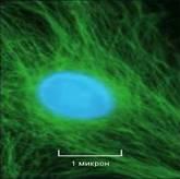 Рис. 1. Слева – строение микротрубочки, справа – цитоскелет, образованный микротрубочками, в клетке соединительной ткани – фибробласте. Микротрубочки окрашены зеленым, ядро – голубым