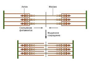 Рис. 3. Скольжение актиновых и миозиновых нитей вызывает мышечное сокращение