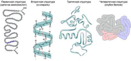Вторичная, третичная и четвертичная структура белка определяется его первичной структурой. В зависимости от последовательности аминокислот в полипептидной цепочке будут образовываться α-спиральные или β-структурные участки, которые затем самопроизвольно «уложатся» в определенную третичную структуру, а у некоторых белков отдельные цепочки еще и объединятся с образованием четвертичной структуры.