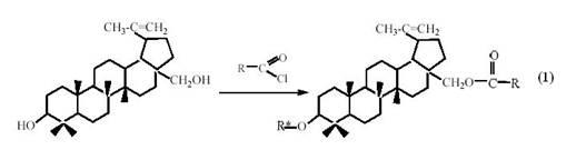 Таким способом можно получить ацилированием бетулина 28-О- (1-адамантат) бетулина, 28-О-гидроциннамат бетулина, 3,28-О-дикаприлат бетулина. В качестве ацилирующих реагентов, как правило, применяют ангидриды или хлорангидриды карбоновых кислот в присутствии пиридина или третичных аминов.