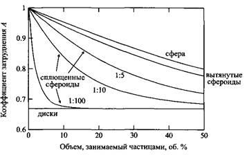 Диффузия растворителей сильно замедляется в присутствии частиц с формой сплющенных эллипсоидов или дисков и умеренно замедляется в присутствии сфер или вытянутых эллипсоидов. Показана зависимость коэффициента пространственного ограничения, т.е. соотношения коэффициентов самодиффузии растворителя в присутствии частиц, препятствующих движению молекул, и чистого растворителя, от объемной доли частиц.