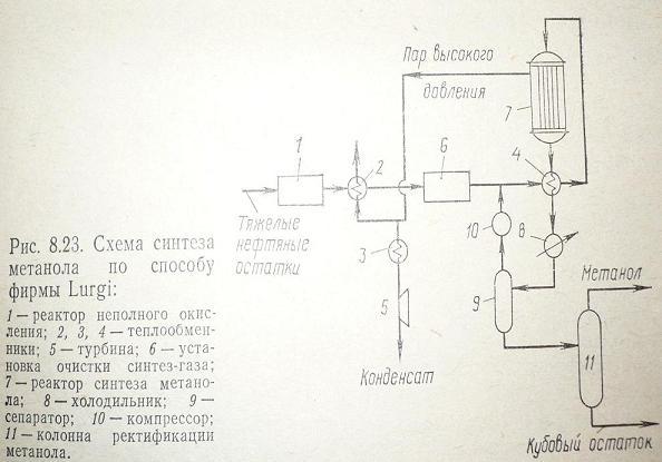 Метанол получают при 5 МПа, используя для получения синтез-газа метана и тяжелые нефтяные остатки и уголь. Окисление исходного сырья ведут при температуре 1400–14500
