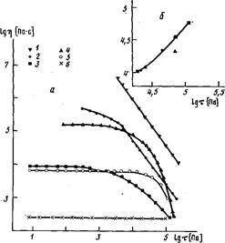 Рис. 1. Зависимость вязкости (а) и модуля высокоэластичности (б) исследованных полимеров от напряжения сдвига: 1-ПЭЛ, 2-U3-2, 3-Пд-З,