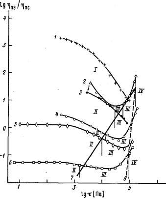 Обращает на себя внимание проявление волокнообразования в изученных смесях в области, ограниченной прямыми 7 и 8, независимо от того, растет или снижается величина отношения в зависимости от напряжения сдвига. Этот факт свидетельствует, по-видимому о том, что в области больших т ведущую роль в волокнообразовании могут играть не касательные, а растягивающие напряжения, сравнимые по величине со значениями т, действующими на входе в капилляр [17].