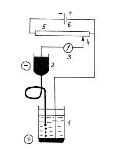 Рис. 1. Схема полярографической установки: 1 - электролизёр; 2 - сосуд с ртутью; 3 - гальванометр; 4 - передвижной контакт; 5 - реохорд; 6 - ак - кумулятор.