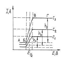 Фиксируя силу тока, проходящего через ячейку, в зависимости от поданного напряжения, получают вольтамперные кривые, называемые в полярографии полярограммами (рис. 2). Форма полярограмм напоминает волну. Первый участок волны (АБ) соответствует начальному моменту процесса, когда протекает только остаточный (конденсаторный или емкостной) ток, связанный с расходом некоторого количества электричества на заряжение двойного электрического слоя на поверхности капли ртути и восстановлением следовых количеств электроактивных примесей.
