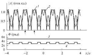 Рис. 1. Распределение амплитуды А (1,2) и фазы Ф (3,4) по поперечной координате х для безграничной волны на расстоянии  стрелками указано положение клювов каустик.