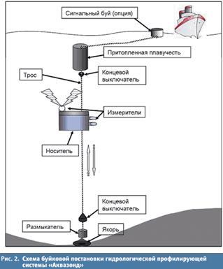 Основа подводной части подсистемы гидрометеорологического мониторинга - заякоренный автоматический профилирующий комплекс «Аквазонд» (см. рис. 2) - своего рода морской грузовой лифт. Этот прибор перемещает полезный груз - измерительную аппаратуру, передвигаясь по тросу, натянутому вертикально между подповерхностной плавучестью и донным якорем. В отличие от традиционных буйковых постановок с размещением приборов на фиксированных горизонтах, в данном случае измеряются непрерывные вертикальные распределения (профили) параметров среды и биоты, что позволяет точно оценивать как дифференциальные, так и интегральные характеристики этих распределений. Наряду с этим носитель может останавливаться - «зависать» на нужное время, чтобы произвести измерения на заданных горизонтах. Передача данных с «Аквазонда» осуществляется по ходовому тросу с помощью магнитных модемов и далее по кабелю или по подводному гидроакустическому каналу в подсистему информационного обеспечения на нефтедобывающей платформе.