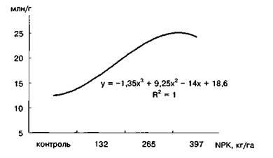 Тривале застосування мінеральних добрив сприяє збільшенню загальної чисельності мікроорганізмів у ґрунті. Але при застосуванні високих доз мінеральних добрив (понад 300 кг/га NPK) можливо пригнічення мікробіологічної діяльності (рис. 2).