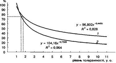 Використання поліномінального рівняння залежності активності фізіологічних функцій тест-організму від рівня забруднення ґрунту ВМ дало змогу провести порівняльну оцінку фітотестів за показниками морфологічного розвитку (біопродуктивність ячменю) і онтогенетичного розвитку (довжина зародкового кореня пшениці). Рівень активної толерантності становив 4,0 і 8,1 у. о. відповідно (рис. 4).