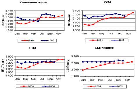 Вторым импортером является Алжир, который также не будет повышать объем закупок. Цены на этот вид молока выросли в связи с тем, что более 60% обезжиренного сухого молока идет в азиатские страны, переживающие экономический подъем. Спрос вызвал рост мирового экспорта. Значительно возросли объемы продаж США и Новой Зеландии – крупнейших поставщиков обезжиренного сухого молока. ЕС свой экспорт сокращал. ФАО полагает, что ситуацией воспользуются США. В этой стране внутренние цены ниже, чем мировые. К тому же Европа снизила свои поставки. Поэтому американцы должны воспользоваться благоприятной ситуацией. Торговля маслом и сыром остается в целом на прежнем уровне, начиная с 2004 года, несмотря на рост цен. В нынешнем году поставки масла должны сократиться (на 2,3%), а сыра – вырасти (на 1,2%). В первом случае все объясняется снижением поставок из ЕС, во втором – ростом экспорта Аргентины. Торговля этими продуктами идет в основном среди развитых стран. Поскольку спрос не меняется кардинально, и здесь чаще применяются всевозможные квоты и тарифы, цены не выросли так, как на другие виды продукции отрасли.