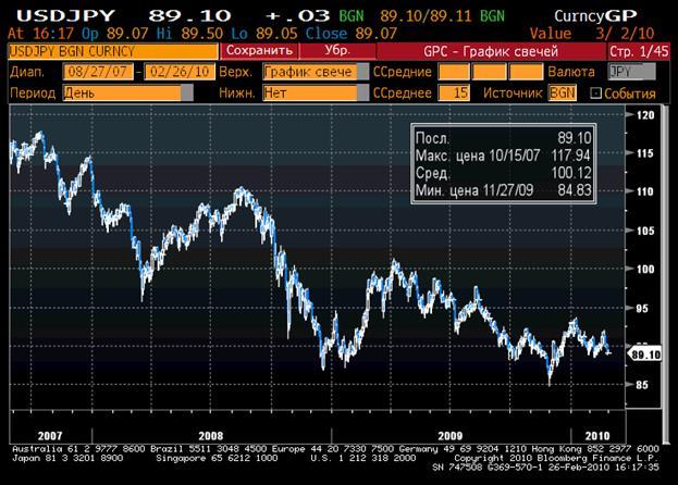 Рис. 2.3 Динаміка японської ієни по відношенню до долара США січень 2009-січень 2010