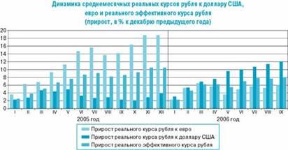 Номинальный курс доллара США к рублю в течение 2006 г снизился на 7,0% , а номинальный курс евро к рублю снизился на 0,6% — до 33,98 руб/евро (График № 1). В результате курс рубля возрос на 3,2%.