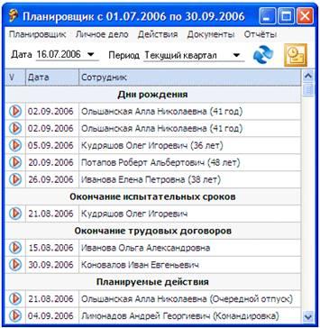 Завдяки функції планування кадрових операцій Фараон допоможе вам складати графіки навчання співробітників, чергових відпусток, атестацій і т.п. При цьому вбудований у Фараон Планувальник робочого часу нагадуватиме вам про заплановані операції, дні народження співробітників, закінченні випробувальних термінів і термінів трудових договорів (Рис 1.3). При необхідності виконується синхронізація Фараона з Календарем в Microsoft Outlook.