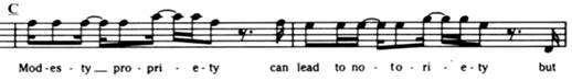 Он создаёт форму с помощью ритма, создавая контраст с помощью фразировки «ап-даун». Суть её в том, что фразы части А начинаются со слабой доли, а фразы части В с сильной. Кроме того фразы части В построены по принципу «вопрос-ответ (?-!)».