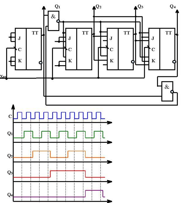 Для повышения быстродействия в счетчике организован параллельный перенос. Параллельный перенос можно сделать в счетчике из 4-х разрядов, т.к. внутренняя схема "И" JK-триггера имеет три входа. Поэтому, при количестве разрядов счетчика больше 4, счетчик разбивается на группы, группа имеет четыре разряда и параллельный перенос, а между группами последовательный перенос. Время срабатывания этого счетчика определяется временем срабатывания JK-триггера.