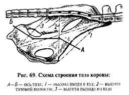 Таз коровы по сравнению с тазом животных других видов менее благоприятен для родового акта, Подвздошные кости поднимаются вверх почти под прямым углом, вследствие чего вертикальный диаметр таза располагается под 3—4-м крестцовым позвонком. Вход и таз имеет форму сплюснутого с боков овала. Поперечный диаметр тазовой полости значительно меньше среднего поперечного диаметра входа в таз. Седалищные гребни представляют собой костные пластинки, поднимающиеся кверху и составляющие значительную часть боковых стенок. Лишь сравнительно небольшой участок последних образован связками таза. Выход из таза с боков ограничен седалищными буграми в виде костных пластин, зажимающих плод при его продвижении кзади. Наконец, вогнутая поверхность крестца и неровное, с углублением, дно тазовой полости придают оси таза форму ломаной линии (рис, 69). Плод имеет максимальную ширину головы в области лобных костей; у него более короткие конечности, чем у жеребенка- Стадия раскрытия шейки матки продолжается до 12 ч. Корова ведет себя более спокойно, чем кобыла. Изредка продолжительно тихо мычит. Под влиянием сокращения матки через раскрытую шейку выпячивается плодный пузырь, состоящий из сосудистой и околоплодной оболочек или алланто-хориона. Плодный пузырь может выпячиваться за пределы вульвы и затем разрываться, но чаше плодные оболочки разрываются еще во влагалище и из родовых путей выступают предлежащие конечности.