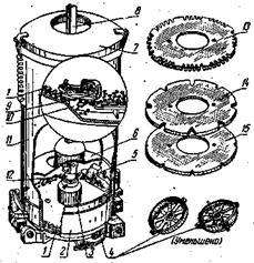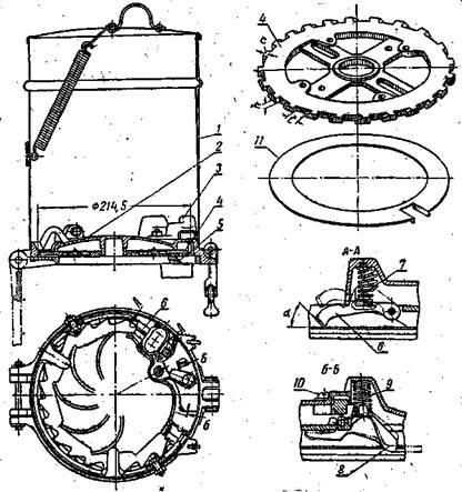 размещен между корпусом-дном и откидным дном. При установке в аппарат диска толщиной 7 мм между ним и откидным дном для компенсации зазора устанавливают кольцо: толщиной 1 мм, а при установке диска толщиной 6 мм укладывают кольцо 11 толщиной 2 мм.