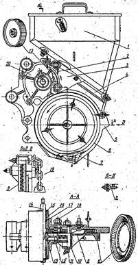 1 — бункер; 2 — чистик отражателя; 3 — накладка; 4 и 20 — крышки; 5 — корпус; 6 — высевающий диск; 7— выталкиватель; 8 — штырь; 9 — шестерня z = 90; 10 — ось; 11 — масленка; .12 — шестерня z = 40; 13 — отражатель семян; 14 — вал-шестерня; 15 — обойма сальника; 16 — втулка; 17 — стакан; 18 — ось шестерни; z= 40; 19 — цепь.