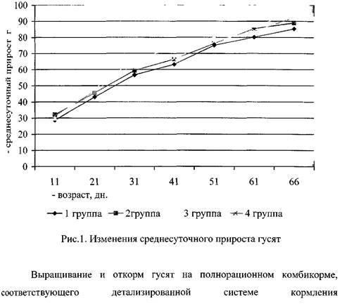 Целесообразность снимать гусей с откорма, в 50-60 - дневном возрасте подтвердила в своих исследованиях Е.И. Ионова (1971,1973) на гусятах горьковской породной группе и на белой итальянской породе, когда наивысший среднесуточный прирост живой массы был получен в 40-дневном возрасте (69,1 г у самок и 81,4 г у самцов), в 60 - дневном он снизился до 54,9 и 59,9 г соответственно, а в 65- дневном возрасте он составил 41,4 и 57,5г.