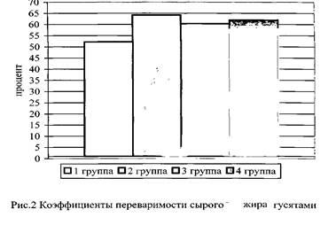 Полученная разница в переваримости питательных веществ рациона привела к тому, что в организме гусят количество обменной энергии от валовой возросло до 72,4%, против 70,6% у гусят, выращенных и откормленных на одном полнорационном комбикорме.