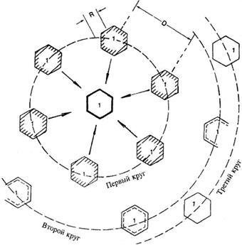 Из (2.3) следует, что эффективность ССПР не зависит от числа каналов на БС и возрастает с уменьшением радиуса ячейки R. В сущности это указывает на то, что уменьшая размеры ячеек можно повысить повторяемость частот, т.е. их одновременное использование в сети. Кроме того, из соотношения (2.3) следует целесообразность уменьшения размерности кластера К. Рассмотрим более подробно влияние размерности кластера на характеристики ССПР, в частности на уровень взаимных помех, возникающих вследствие повторного использования рабочих частот (рис.2.1). Взаимные помехи можно разделить на два вида.