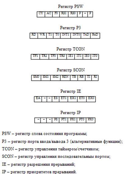 ОМЭВМ (МК семейства MCS-51) имеет: 32 POH; 128 определяемых пользователем программно-управляемых флагов; набор регистров специальных функций. POH и определяемые пользователем программно-управляемые флаги расположены в адресном пространстве внутреннего ОЗУ данных. Регистры специальных функций (SFR, SPECIAL FUNCTION REGISTERS) с указанием их адресов приведены в таблице 1.